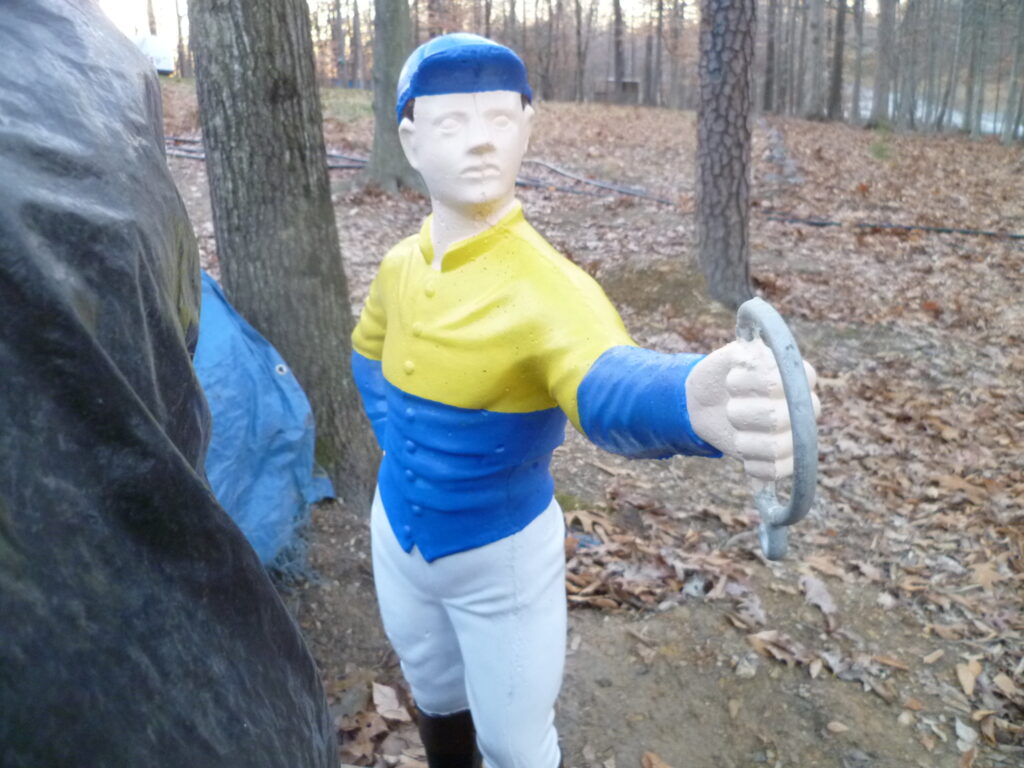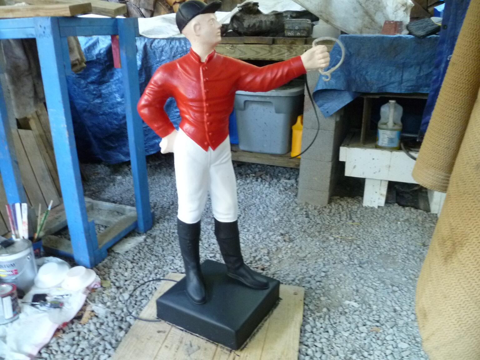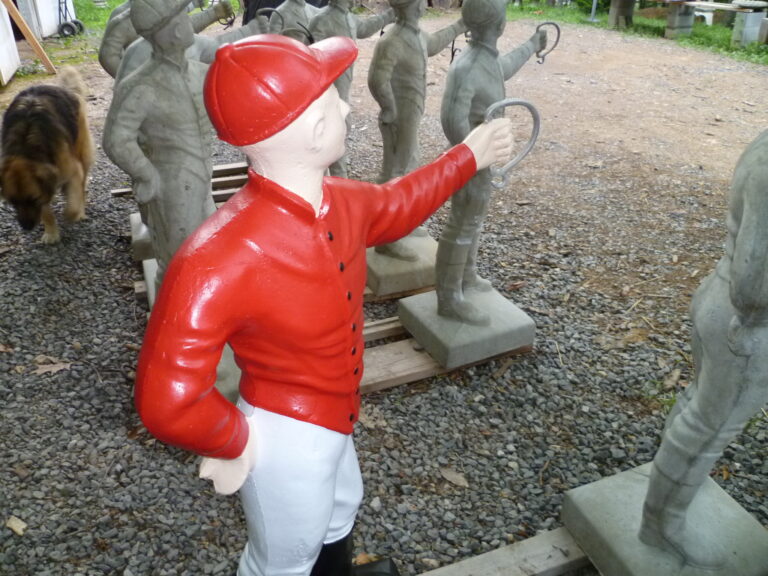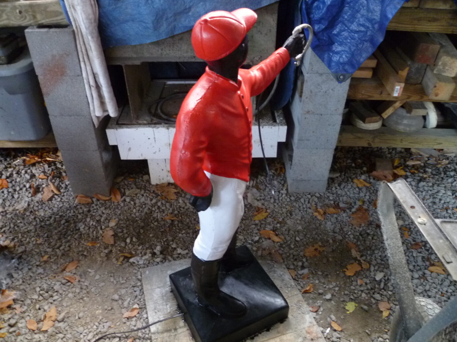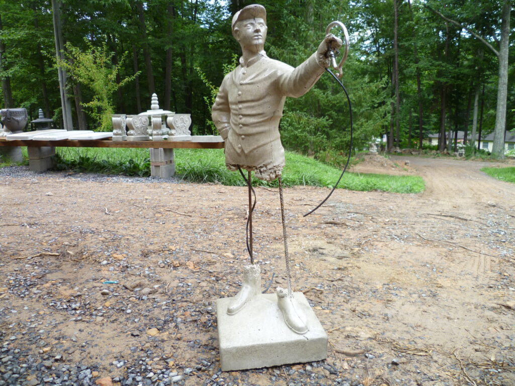 We’ve made so many of these… There’s a good chance if you’ve seen a new Cavalier Lawn Jockey on the east coast it might be one of ours. An aluminum/metal ring is integrated into the cast and is perfect for a hanging a light/lantern. Included with each jockey is a custom made pallet which makes traveling a cinch.
