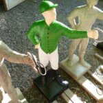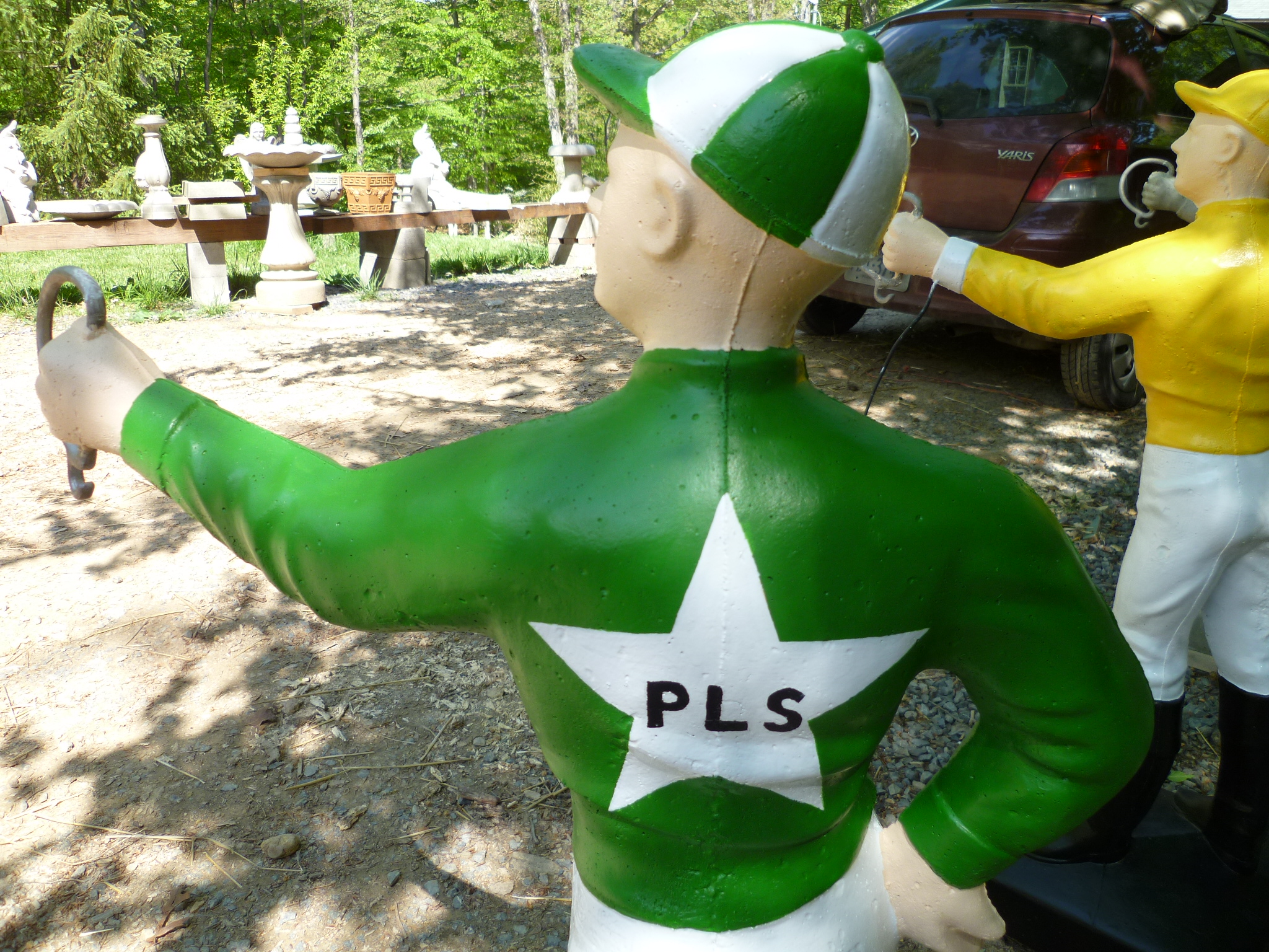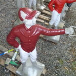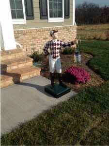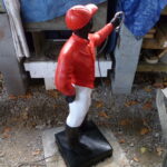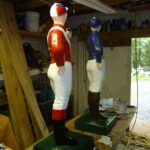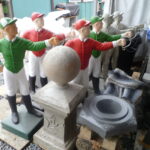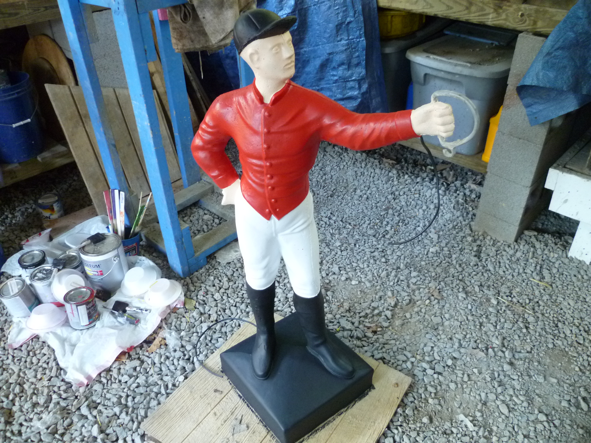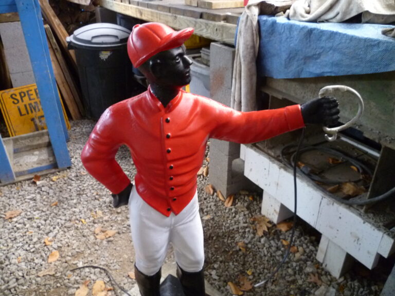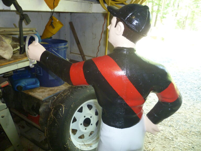 We’ve made so many of these… There’s a good chance if you’ve seen a new Cavalier Lawn Jockey on the east coast it might be one of ours. An aluminum/metal ring is integrated into the cast and is perfect for a hanging a light/lantern. Included with each jockey is a custom made pallet which makes traveling a cinch.